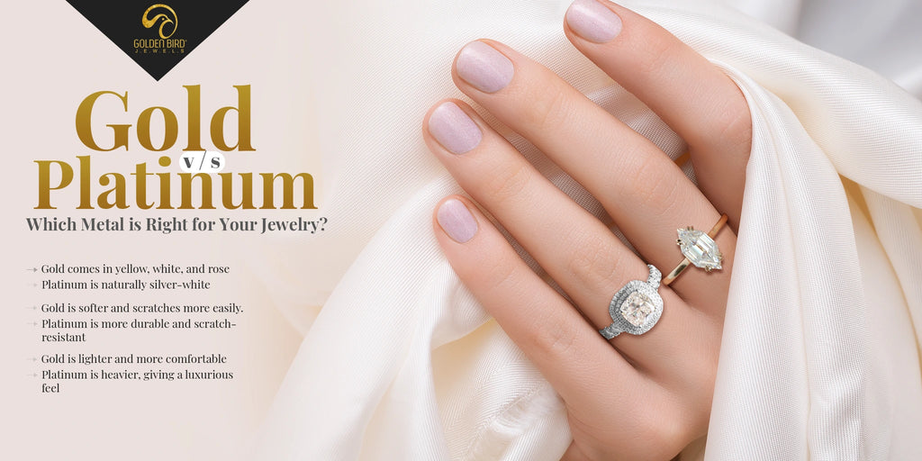Gold is lighter and more affordable but less durable. Platinum is hypoallergenic and durable but heavier and typically more expensive.